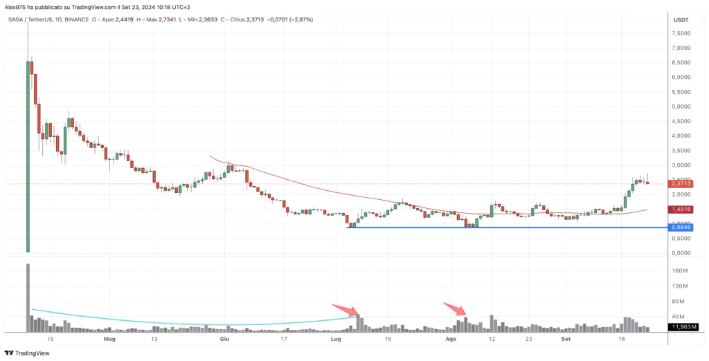 Analizzando i movimenti più recenti di Saga, nel grafico seguente abbiamo evidenziato il periodo dal minimo di luglio fino a oggi. Qui si può notare come il prezzo di $SAGA avesse tentato un doppio minimo, ma si fosse poi bloccato sulla resistenza statica a 1,77 USDT a metà agosto.