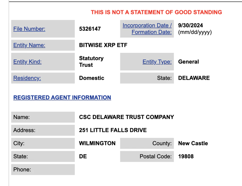 L’unica prova della cosa rimane la registrazione presso il Registro delle Imprese del Delaware di una società che si chiama XRP Bitwise Trust, come riportiamo nello screenshot che abbiamo effettuato direttamente presso il sito dell’autorità che se ne occupa.