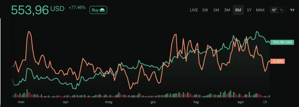 Nel 2024 si è verificata una nuova spinta rialzista, culminata con un massimo di periodo a 718$ nell’aprile 2024. Da quel livello è iniziata una nuova discesa: senza il superamento del massimo di marzo 2024, i primi mesi del 2025 si sono mostrati ribassisti, con un minimo a 250$. Da lì è partito un rimbalzo con quattro mesi consecutivi in verde, ad eccezione di agosto che, al momento, registra un contenuto -1%.