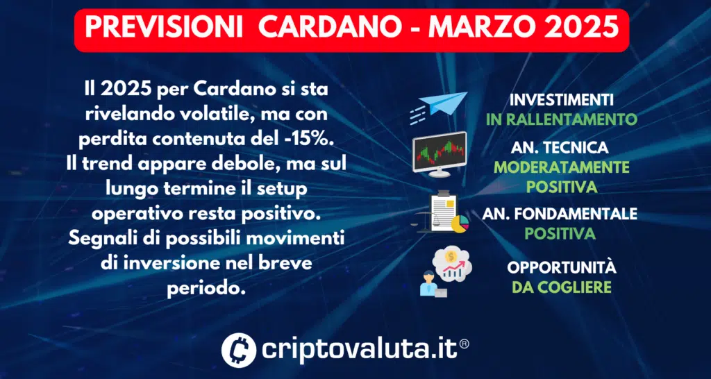 La scheda previsionale di Cardano, è pensata per offrire informazioni e indicazioni in particolare a coloro che intendono assumere o mantenere posizioni operative, senza l’esigenza di monitorare in modo costante e quotidiano l’andamento dei prezzi. Gli aggiornamenti vengono programmati, così da fornire scenari aggiornati e in sincronia con i cambiamenti e la volatilità del mercato crypto altamente alta in questo fine 2025.