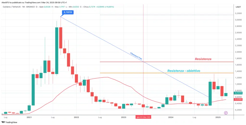 Nel 2025, il prezzo di ADA si sta muovendo in swing ed è tendenzialmente ribassista. A Febbraio ha registrato un minimo a 0,5060 USDT con un ribasso mensile del 32%, non più violato. In marzo il prezzo ha avuto uno spike rialzista con massimo a 1,1747 USDT su un annuncio social di Trump di Cardano inserito in un’ipotetica riserva federale crypto, che poi è stato smentito.