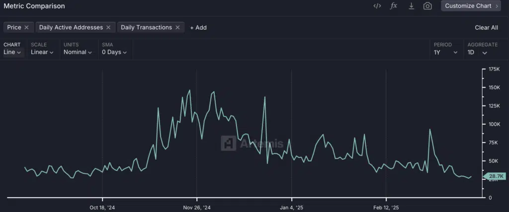 L’ecosistema Cardano ha completato nel luglio 2025 l’aggiornamento Chang, che inaugura l’era Voltaire introducendo una governance on-chain decentralizzata. Sul fronte dei dati on-chain, i Daily Active Users mostrano un progressivo indebolimento: gli indirizzi attivi oscillano da mesi tra 20.000 e 30.000, con il valore del 16 novembre fermo a 21.700, segnale di un utilizzo moderato e in calo.