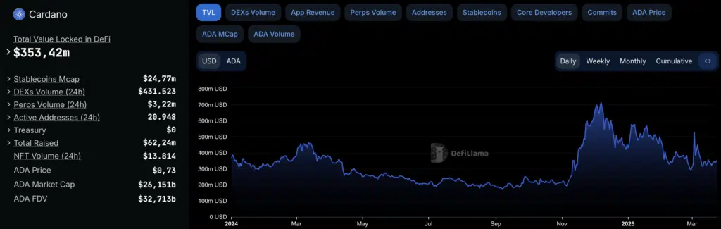 L’andamento della Total Value Locked (TVL) in DeFi di ADA ha trovato un incremento negli ultimi due mesi del 2024. A novembre sull’accelerazione generalizzata del mercato crypto c’era stato anche un un picco a 886 milioni da dove poi ha ripreso a scendere. Il TVL è sceso fino agli attuali 243,13 milioni USDT, segnando un crollo di oltre il -74%. L’andamento evidenzia un progressivo indebolimento dell’attività DeFi sulla rete, con un calo costante e privo di segnali concreti di inversione.