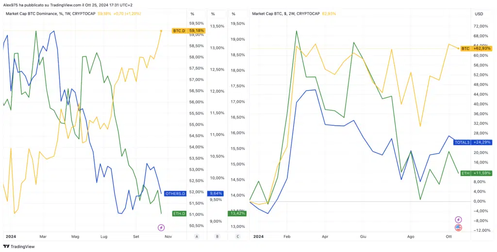 Nell’immagine allegata, abbiamo riportato sulla destra l’andamento della Market Cap di Bitcoin da inizio 2024, a confronto con quella di Ethereum e delle Altcoin (Total 3, escluso BTC ed ETH). Sul grafico di sinistra, invece, è riportato l’andamento della dominance di Bitcoin a confronto con Ethereum e le Altcoin, dove è anche evidente la fase di difficoltà di Ethereum.