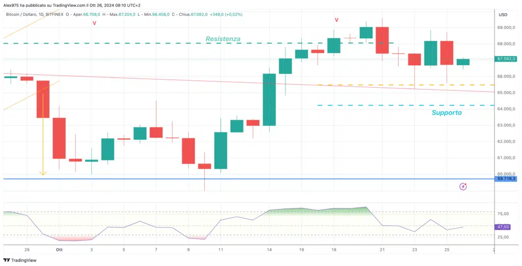 In questo scenario il prezzo sta scambiando ancora attorno all’area dei 68.400$ che è una zona di resistenza che avevamo già segnalato dall’analisi del 21 Settembre: