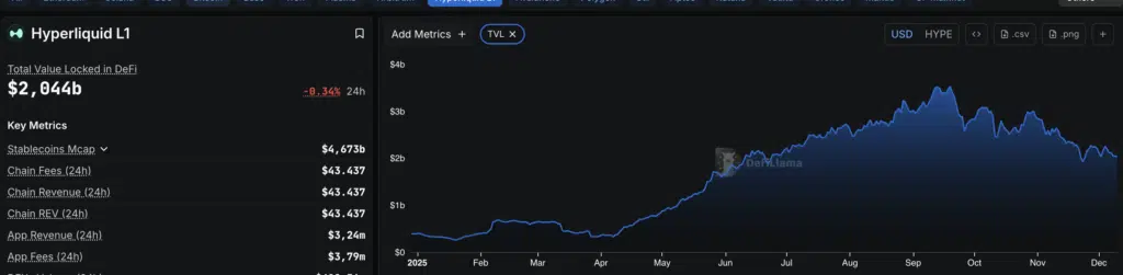 Successivamente la curva ha evidenziato una serie di oscillazioni, con massimi relativi tra settembre e ottobre, seguiti da una graduale contrazione. Attualmente il TVL si attesta a 2,044 miliardi, evidenziando una fase di stabilizzazione dopo mesi di volatilità. Questa cifra colloca Hyperliquid tra le principali piattaforme DeFi emergenti