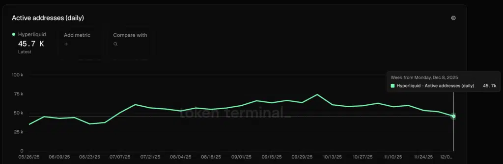 La metrica Active Addresses (daily) di Hyperliquid mostra un andamento stabile ma leggermente decrescente nelle ultime settimane.