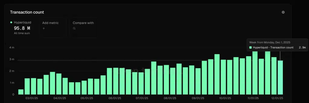 Attraverso la metrica Transaction Count di Hyperliquid evidenzia una crescita progressiva delle operazioni on-chain nel corso del 2025. Dopo una fase iniziale più contenuta, il numero settimanale di transazioni ha superato stabilmente i due milioni, con picchi vicini ai tre milioni tra ottobre e novembre.