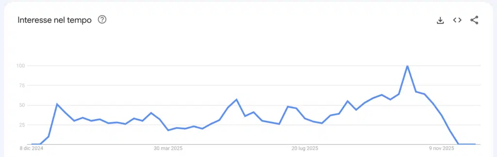 Dopo un forte aumento registrato a inizio novembre, l’attenzione è rapidamente diminuita, tornando su valori minimi. La sequenza indica un interesse altamente ciclico, sensibile alle notizie e all’andamento complessivo del settore.