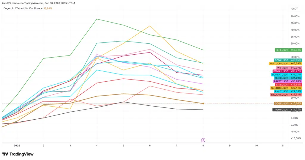 Il mese di gennaio si sta mostrando positivo per l’ecosistema crypto anche se in contrazione negli ultimi due giorni. Tuttavia ci sono ancora rialzi rilevanti in particolare su alcune meme coin, dopo il pessimo andamento del 2025 che le aveva viste protagoniste di profondi ritracciamenti. A guidare il recupero tra le principali meme coin per market cap, troviamo Pepecoin, seguita da Shiba Inu e Dogecoin.