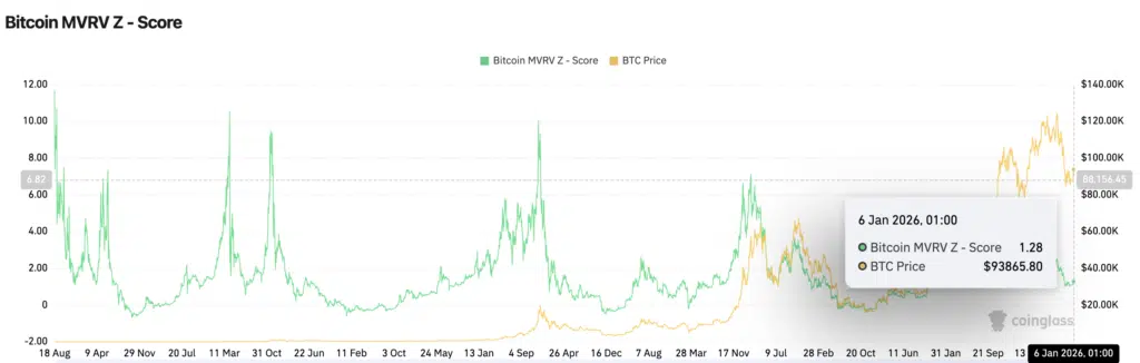 Attualmente il MVRV Z-Score si muove in area 2–3. Questo livello indica una valutazione equilibrata, lontana sia dalla sottovalutazione profonda sia dalle condizioni di euforia. In termini ciclici, Bitcoin non mostra segnali di bolla, ma si trova in una fase di interdizione del trend.
