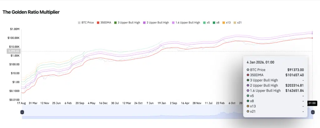 Attualmente la banda 1.6x transita in area 162.651$, mentre la 2x supera i 203.000$. Con Bitcoin intorno a 92.000$ e la 350 DMA in area 101.657$, il prezzo resta sotto il trend di lungo periodo.