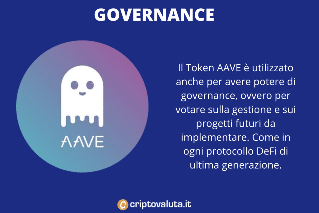 Come la maggior parte dei progetti di finanza decentralizzata di ultima generazione, anche AAVE si comporta da share, ovvero da titolo per poter votare nelle decisioni di governance. Nel caso di un sistema già così orizzontale, la decisione è particolarmente interessante, perché permette anche di implementare modifiche, scegliere nuovi modelli di sviluppo e modificare quelli in corso a chi partecipa, in parità, con gli altri.