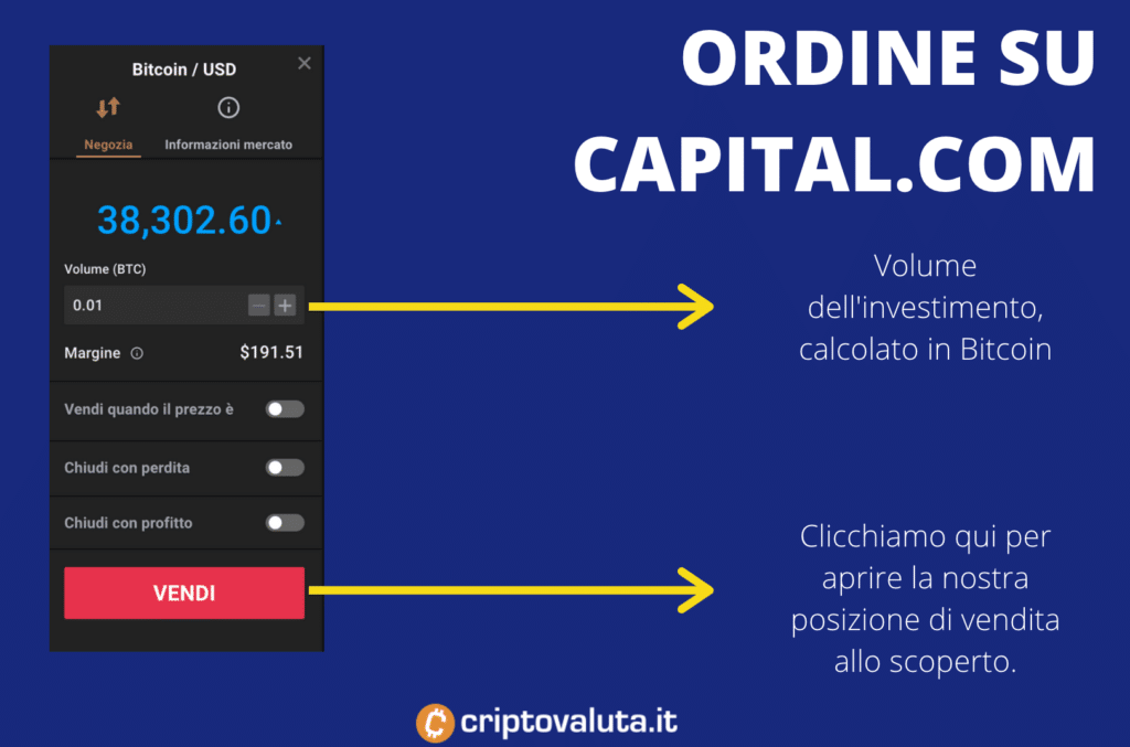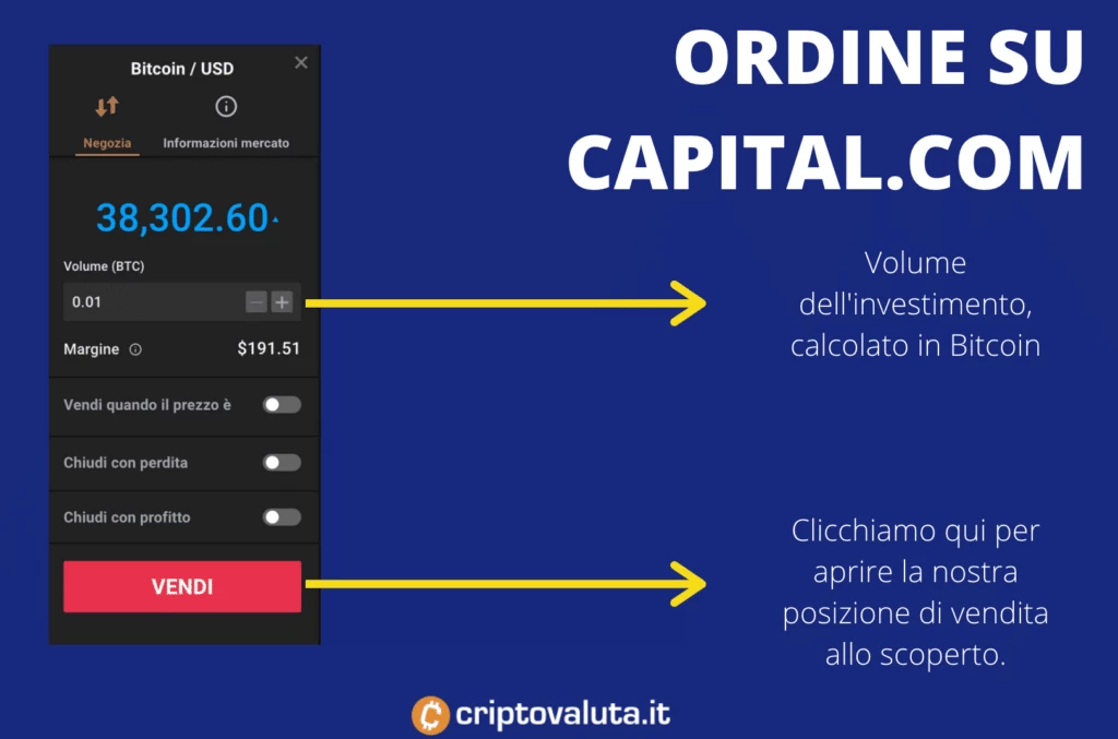 • Ordine: dal listino clicchiamo su Vendi. Avremo accesso sulla destra alla schermata di ordine di Capital.com. Inseriamo qui la quantità di denaro che vogliamo investire (anche questa volta sarà appunto capitale virtuale) e clicchiamo su Vendi. Avremo così puntato, con il nostro denaro virtuale, sul ribasso di Bitcoin. Ecco fatto il nostro primo trading allo scoperto su Bitcoin. In caso di ordine al rialzo, sarà sufficiente cliccare su Acquista e procedere come indicato.