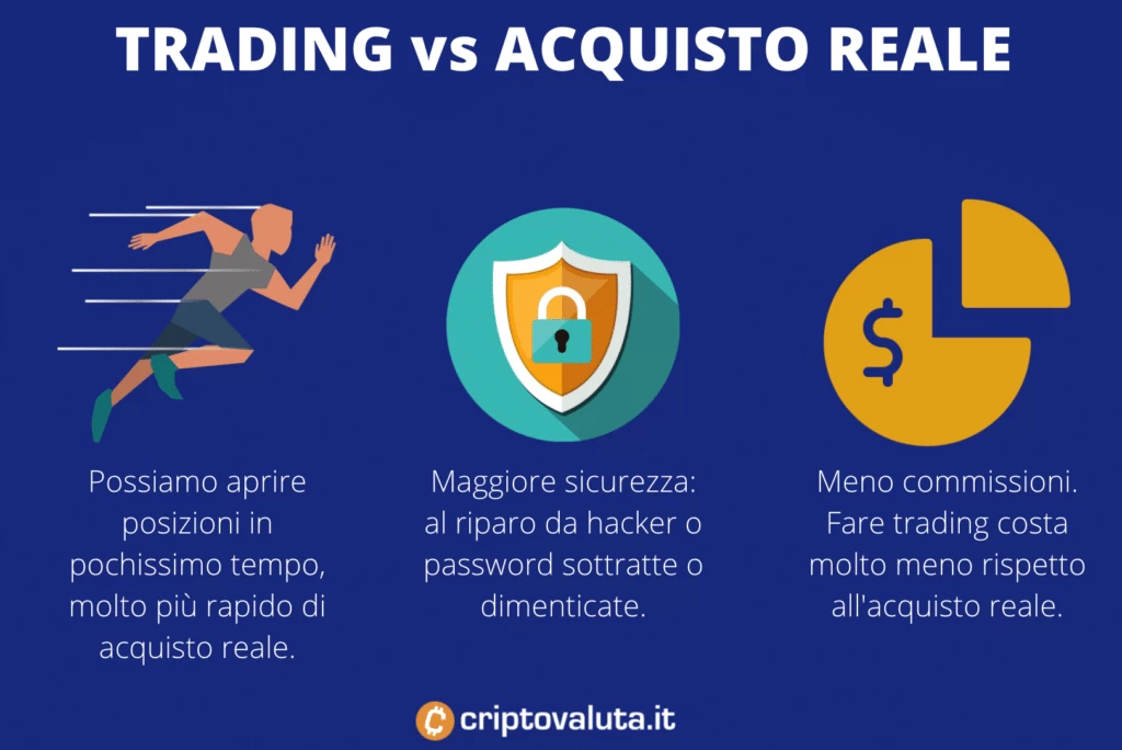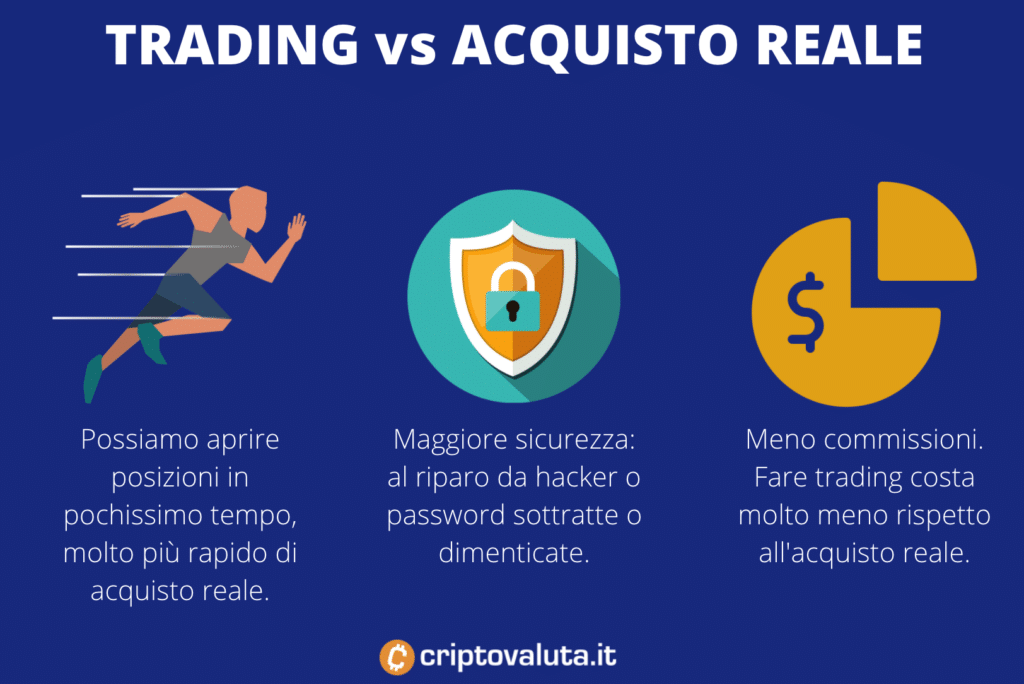 Fare trading in Bitcoin o acquistarli realmente sono due operazioni difficilmente comparabili. Chi vuole investire, soprattutto se su orizzonti temporali di breve periodo, dovrebbe preferire la prima delle due soluzioni, per una serie di motivi che analizzeremo in questa sezione.