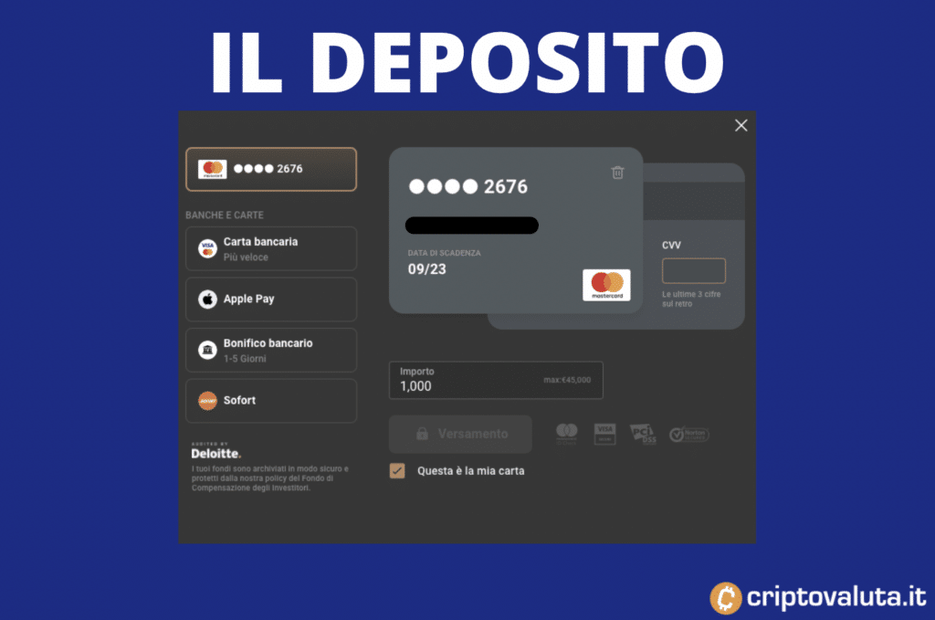 Se scegli di depositare tramite carta di credito o portafogli elettronici, il deposito è immediato. Appena terminato il pagamento potrai già procedere ad investire sui mercati disponibili, senza più limiti. Per il bonifico si dovranno invece attendere i tempi tecnici, che non dipendono da Capital.com, ma dalle banche.