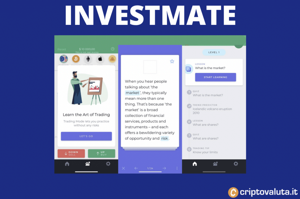 Investmate è la seconda app sviluppata da Capital.com, uno sforzo senza rivali nel campo della formazione offerta dai broker. Si tratta di un’app completamente dedicata all’apprendimento. Il pubblico ideale è fatto di persone inesperte che vogliono passare ad un livello di conoscenza intermedio. Non troviamo soltanto concetti di base, infatti, ma anche approfondimenti su alcuni periodi dell’economia e su basi micro- o macroeconomiche di grande utilità.