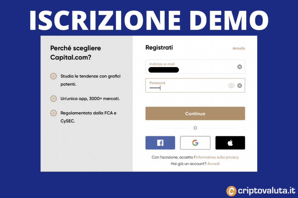 IDENTIFICAZIONE: seguendo le regole europee, durante la fase di registrazione ti saranno chieste informazioni personali sul reddito. Non si tratta di Capital.com che si comporta da ficcanaso, ma del rispetto sulle leggi sulle piattaforme di investimento imposte da ESMA.
