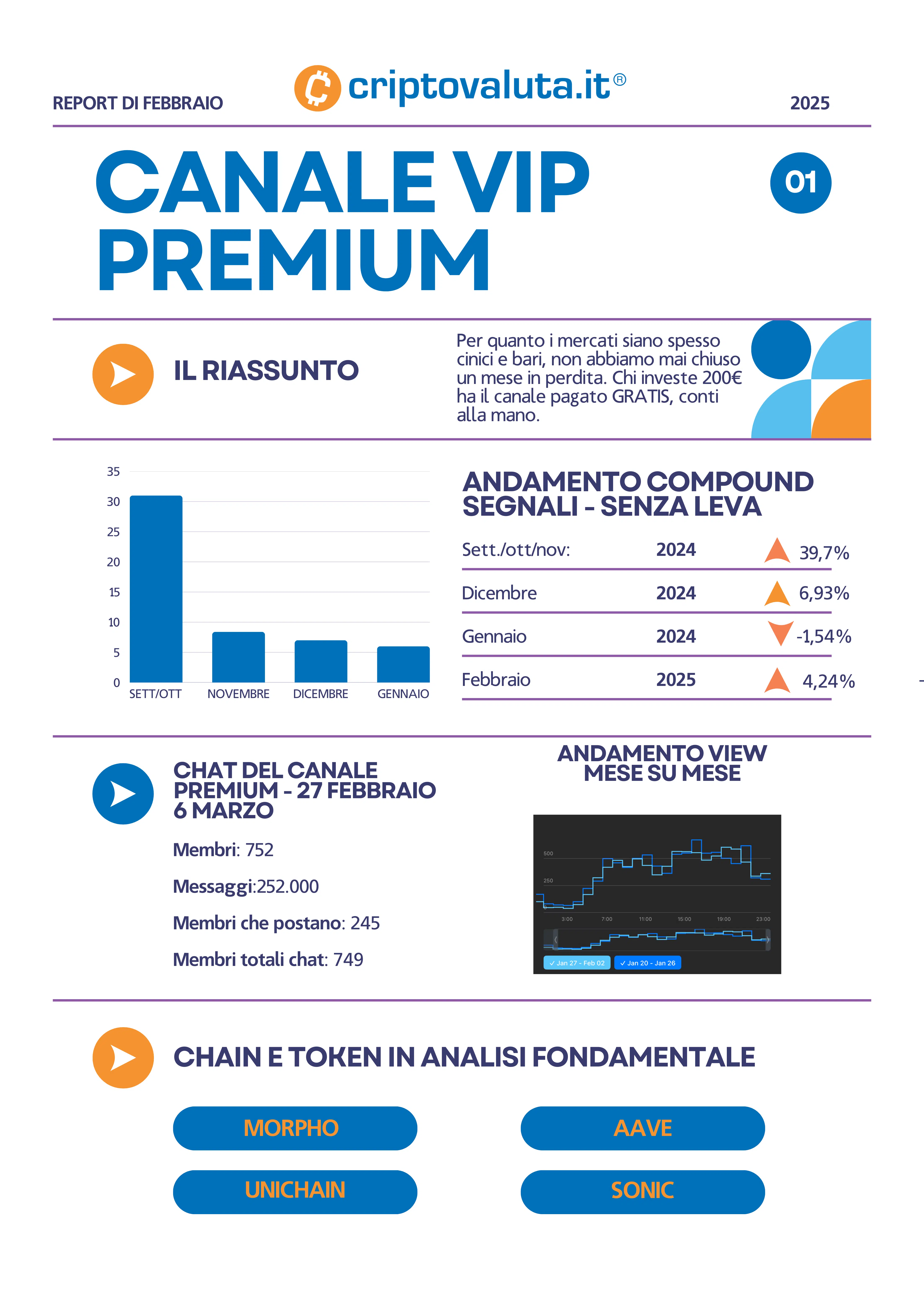 A grande richiesta dei nostri utenti abbiamo deciso di lanciare un gruppo privato PREMIUM VIP al quale si può accedere con un piccolo corrispettivo e che propone – ogni mese – un corso completo per imparare tutto sulle crypto a partire dei segnali di crypto trading (win rate +72%) passando per l’analisi di airdrop e nuove chain, a spiegazioni ed approfondimenti sulla correlazione tra assets di finanza tradizionale e le crypto, pillole e spunti di macroeconomia etc. Un corso che è un pacchetto completo formato da:
