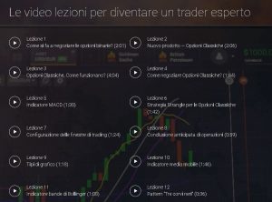 Il broker offre a tutti i clienti l’opportunità di affinare le tecniche di trading con diverse video-lezioni. Queste guide vertono su diversi argomenti: dalla spiegazione su cosa sono le opzioni binarie fino all’utilizzo degli strumenti di trading. Tutte le lezioni sono in lingua italiana e risultano di facile comprensione.