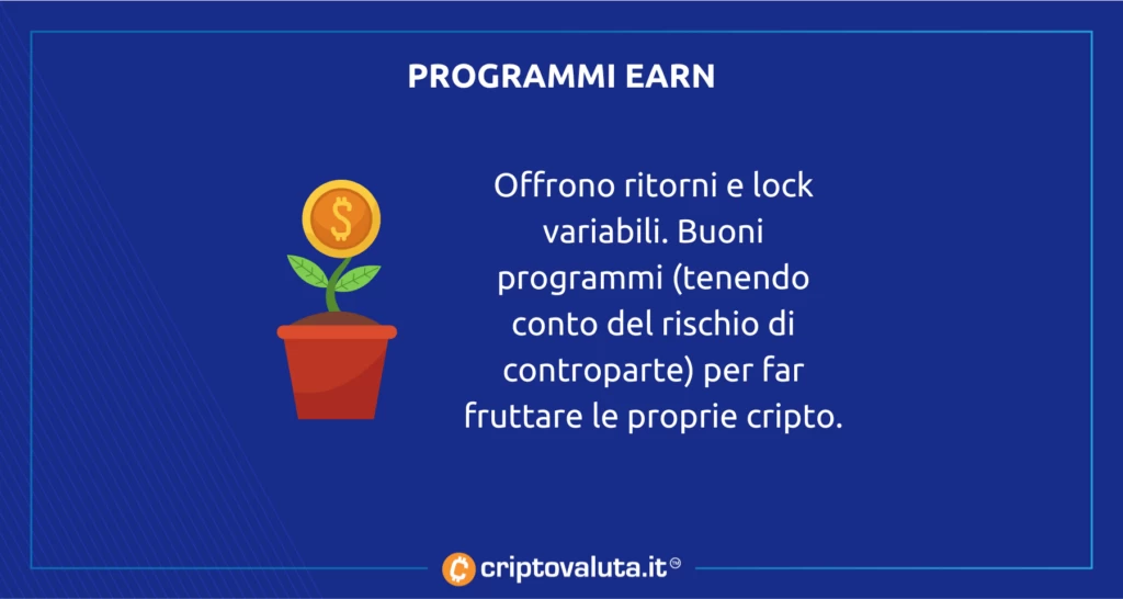 SU MOLTE CRIPTOVALUTE: possiamo utilizzare il programma Earn su diverse criptovalute. Sono presenti tutti i principali coin e token, sui quali vengono pagati in genere interessi in linea con quelli di mercato.