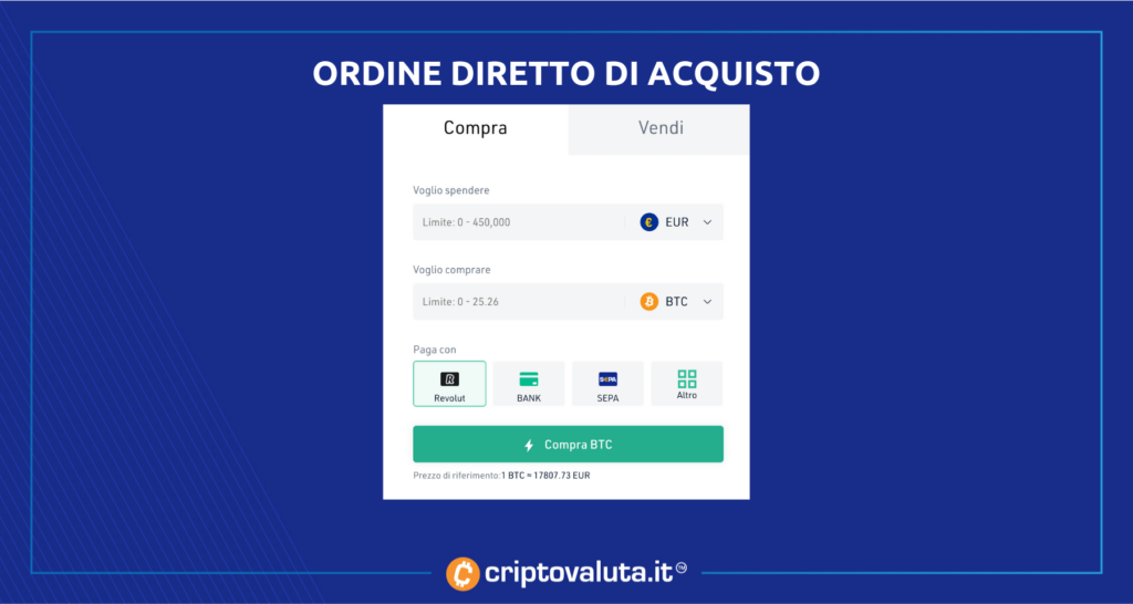 Il servizio principale che possiamo utilizzare una volta che ci saremo iscritti a KuCoin è quello dell’acquisto diretto di crypto o Bitcoin. Possiamo utilizzare questo servizio per comprare o con il nostro saldo in Euro, oppure ancora tramite carta di credito o prepagata. Per accedere a questo servizio dovremo essere registrati e verificati, ma di questo ci occuperemo più avanti nel corso della nostra guida ai servizi di KuCoin. In acquisto diretto sono offerti tutti i token e i coin che sono disponibili anche presso la sezione trading.