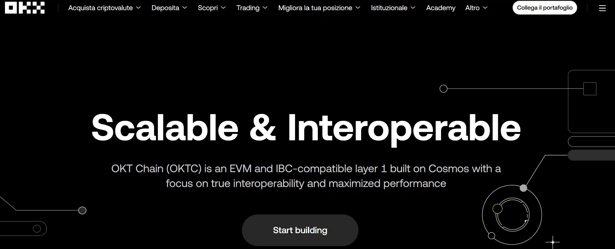 - Interoperabile: OKTC è pienamente compatibile con la EVM di Ethereum ed anche con IBC. Il migliore dei due mondi possibili – per una piena connettività anche con i network più importanti e blasonati.
