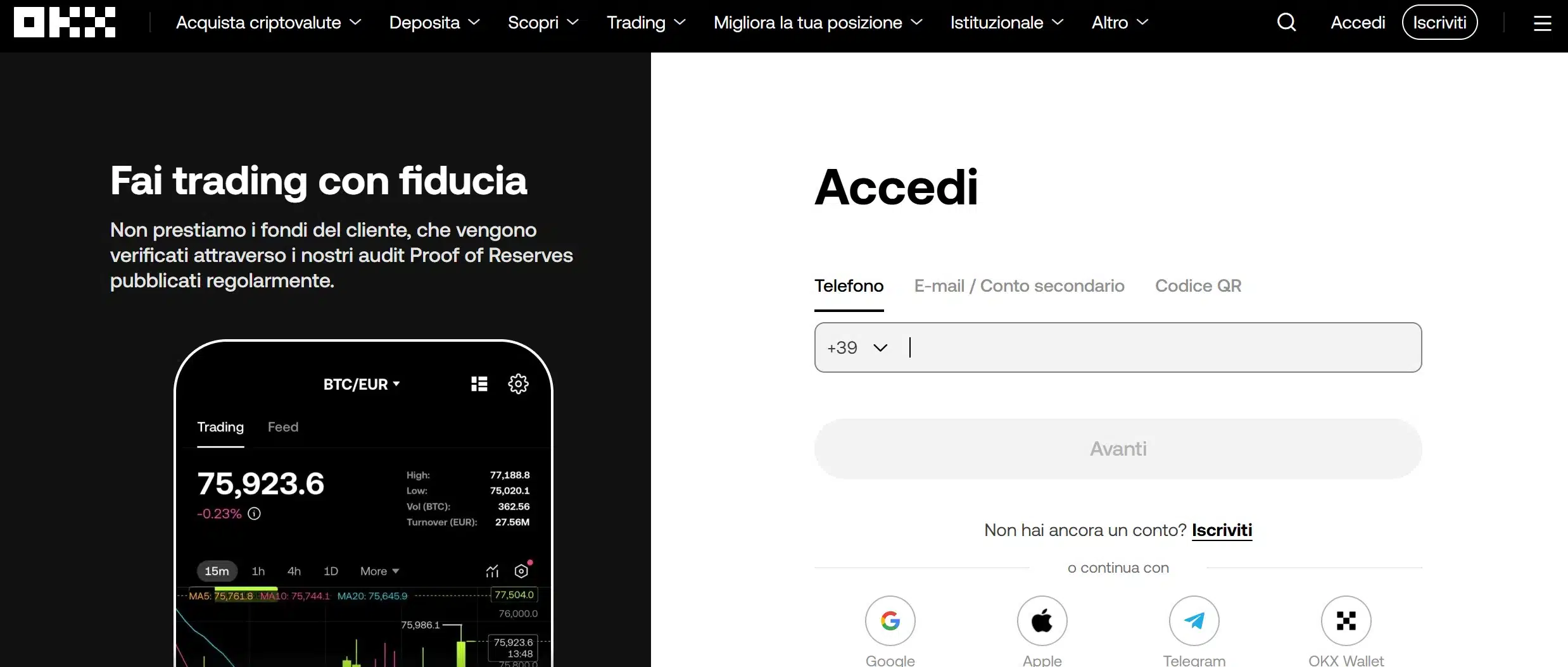 Le modalità di accesso sono tre. Puoi decidere di autenticarti con il numero di telefono, l’indirizzo di posta elettronica ed anche il codice QR da inquadrare con la telecamera. Immesse le credenziali, puoi finalmente entrare sulla piattaforma ed iniziare ad operare in modo autonomo. Anche per il login sono ovviamente presenti le procedure rapide con account Google, Apple, Telegram e Wallet OKX.
