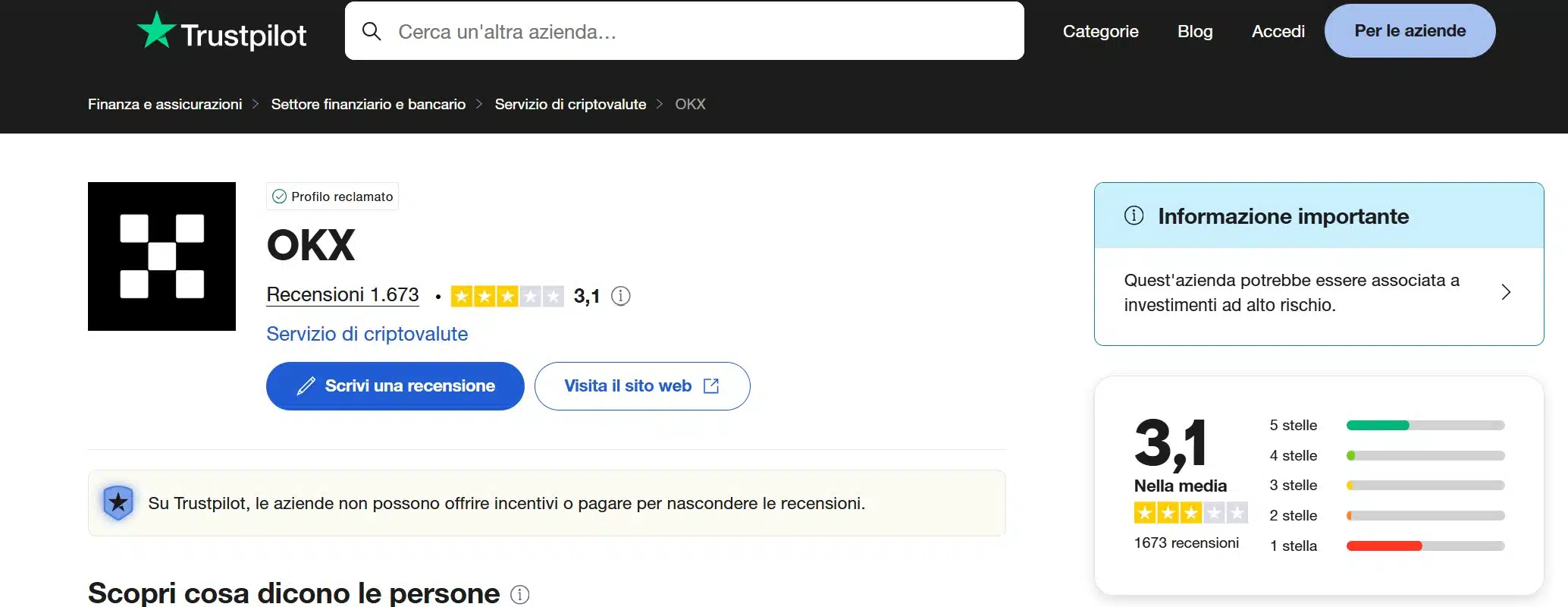 Al momento di questa stesura, sulla base di 1.673 recensioni, la valutazione di OKX su TrustPilot è di 3,1 stelle su 5. È un punteggio mediamente alto per i servizi legati al mondo delle crypto, che purtroppo su TP tendono a ricevere recensioni negative anche quando i problemi che gli utenti hanno riscontrato non sono responsabilità di OKX.