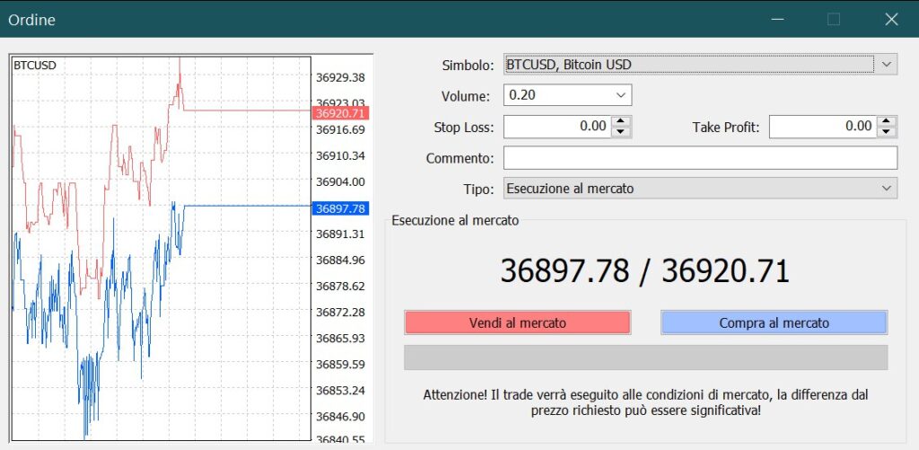 Quarto step: confermare l’ordine. Per aprire un ordine ci basterà pigiare sulla tastiera F9, per vedere aprire la Schermata di Ordine di MetaTrader 4. Al suo interno troviamo diverse sezioni da poter compilare. Simbolo riporta l’asset sul quale stiamo investendo. Nel nostro caso Bitcoin contro USD (BTCUSD). Nella sezione Volume dobbiamo inserire quanti Bitcoin vogliamo acquistare tramite CFD.