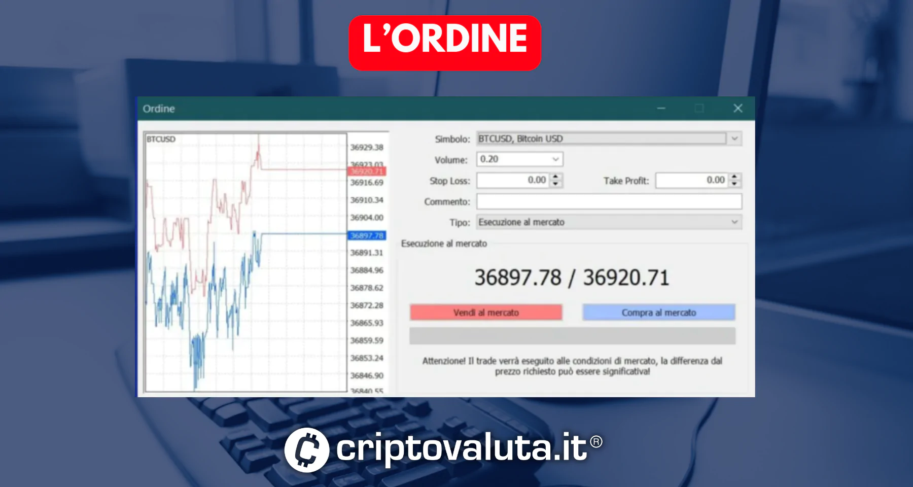 Quarto step: confermare l’ordine. Per aprire un ordine ci basterà pigiare sulla tastiera F9, per vedere aprire la Schermata di Ordine di MetaTrader 4. Al suo interno troviamo diverse sezioni da poter compilare. Simbolo riporta l’asset sul quale stiamo investendo. Nel nostro caso Bitcoin contro USD (BTCUSD). Nella sezione Volume dobbiamo inserire quanti Bitcoin vogliamo acquistare tramite CFD.