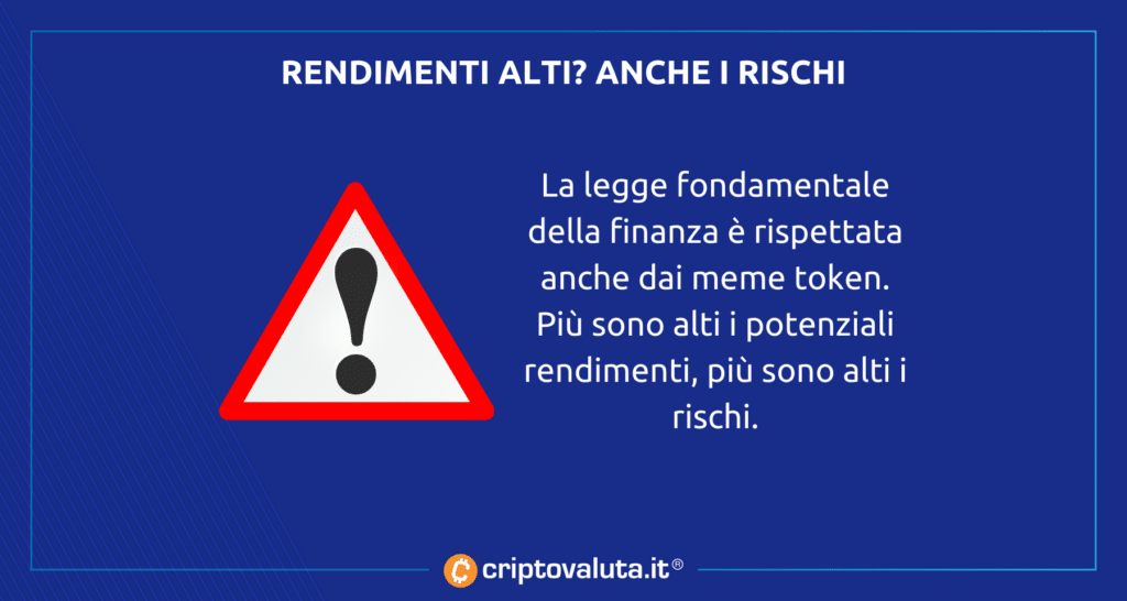 Come vedremo più avanti però – a questa possibilità corrispondono dei rischi altrettanto importanti. Non esistono pasti gratis – e neanche facili – neanche nel mondo delle criptovalute. E chi investe in token meme si troverà a fare i conti con rischi che non sono presenti sui mercati delle criptovalute più stabili.