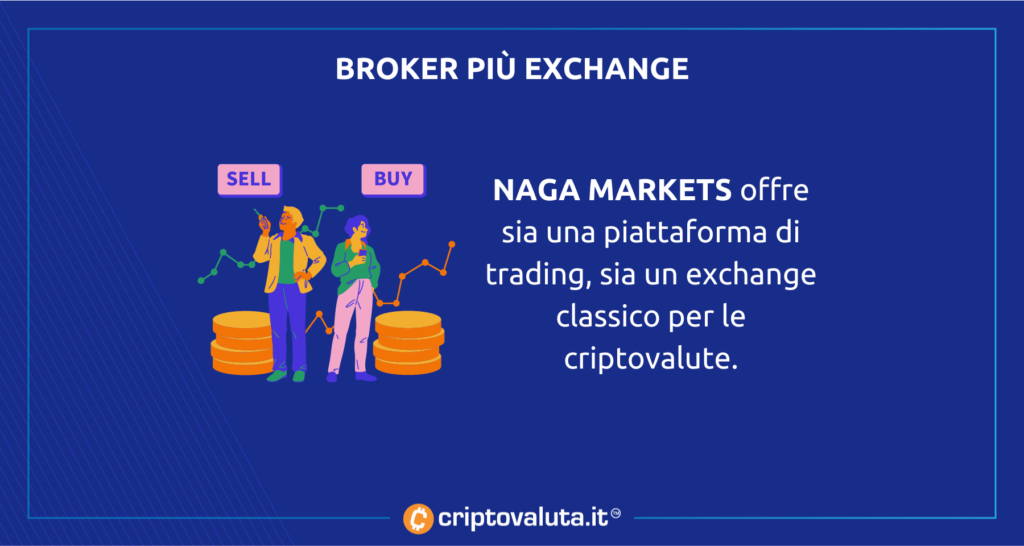 Naga Markets è un intermediario in forma di broker CFD che offre accesso a listini piuttosto completi di criptovalute, inserite all’interno di un servizio più ampio di investimento. Lo stesso include anche asset che arrivano da altri mercati. Tramite Naga Markets (quotato anche i Borsa) possiamo infatti investire anche in Forex, Materie Prime, azioni italiane e straniere, con una buona selezione di ETF e di Indici, per chi dovesse preferire investimenti strutturati e gestiti.