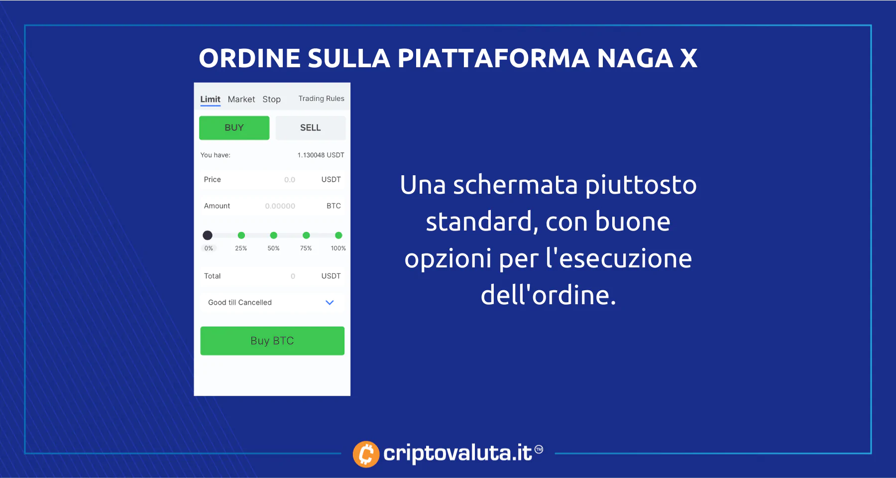 - Duplice piattaforma: quello che acquistiamo via Naga Trading è un CFD, ovvero un contratto per differenza che replica l’andamento di Bitcoin. Per comprare effettivamente Bitcoin e poi trasferirli verso un wallet esterno è necessario passare da NAGAX (non abbiamo quindi un unico hub).