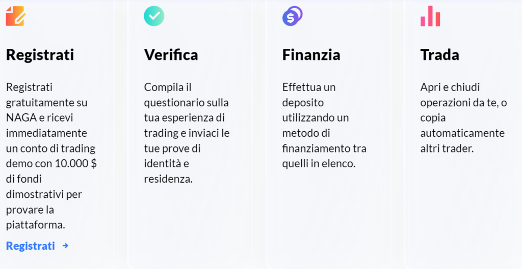 Aprire un conto è semplice e gratuito e ci permetterà di testare tutte le funzionalità di Naga Markets anche tramite conto demo, con 10.000$ di capitale virtuale. Capitale che potremo anche permetterci di perdere, perché non sarà capitale reale che dovremo pagare di tasca nostra. Andando sulla pagina ufficiale, è possibile cliccare sulla voce “Inizia ora”, per aprire la schermata di riferimento: