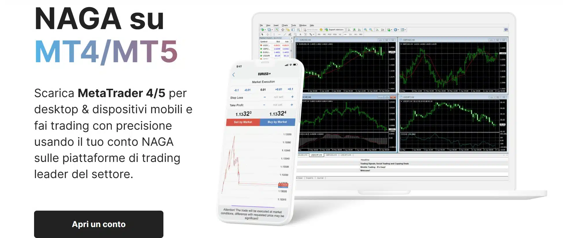 MetaTrader non ha di certo bisogno di presentazioni e tramite Naga vi è la possibilità di scaricare sia la versione MT4 che la versione MT5. In entrambi i casi troviamo un numero molto elevato di indicato di trading, strumenti di studio e tutto l’occorrente per poter procedere in autonomia con l’analisi crypto, o di altre asset class. Permesso anche l’utilizzo degli expert advisor, da poter associare anche a soluzioni di trading automatico tramite bot e robot di trading avanzati.