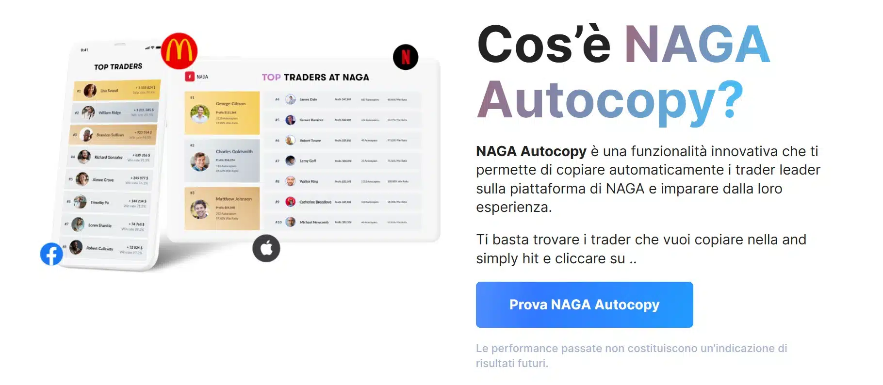 NAGA Markets offre la possibilità di copiare i trader più bravi, quelli che hanno ottenuto un maggior profitto, o che offrono uno stile di trading più simile al nostro. Il servizio è uno dei più interessanti, prende il nome di Autocopy ed offre la possibilità anche ai principianti di cominciare ad esporsi verso i mercati, crypto e non, sempre tenendo conto dei rischi.