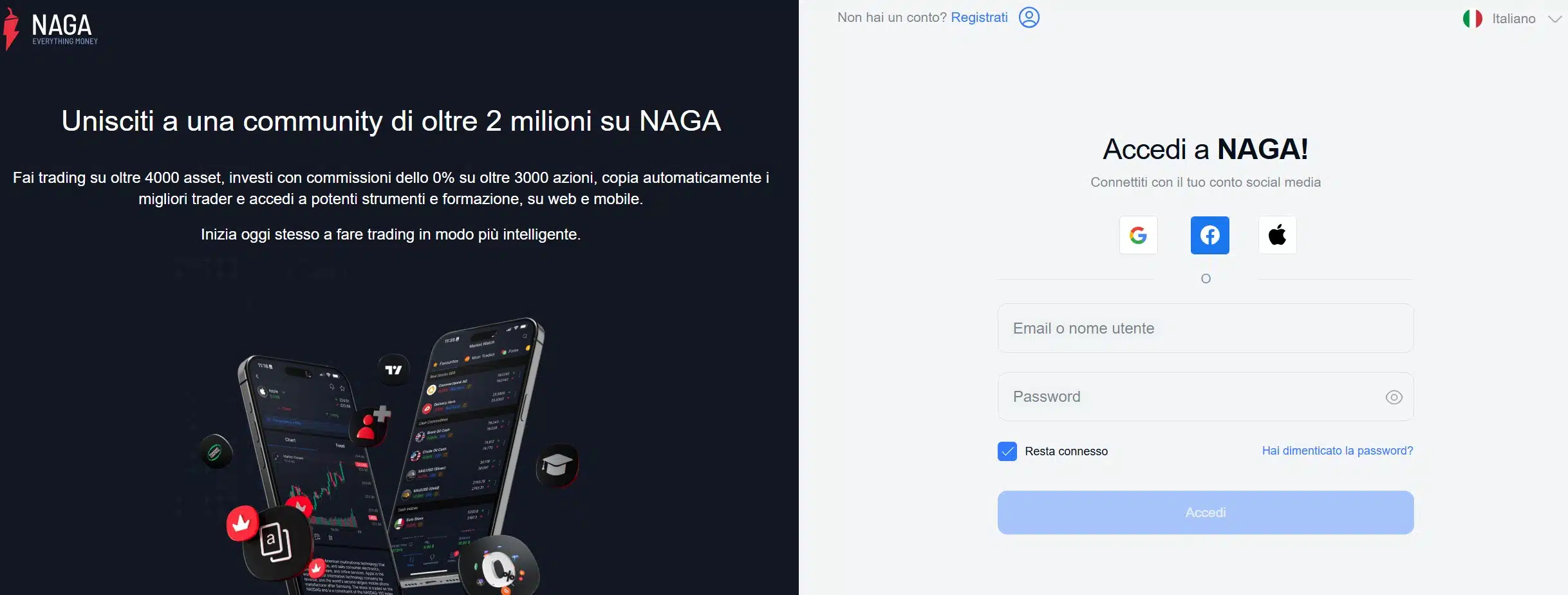 Per unirsi alla community, con oltre 2 milioni di utenti ed effettuare quindi il login su Naga, è possibile seguire una procedura molto semplificata. Ci si reca nuovamente all’interno della pagina ufficiale e si clicca in questo caso sulla voce “Accedi”, presente in alto a destra. Comparirà questa sezione: