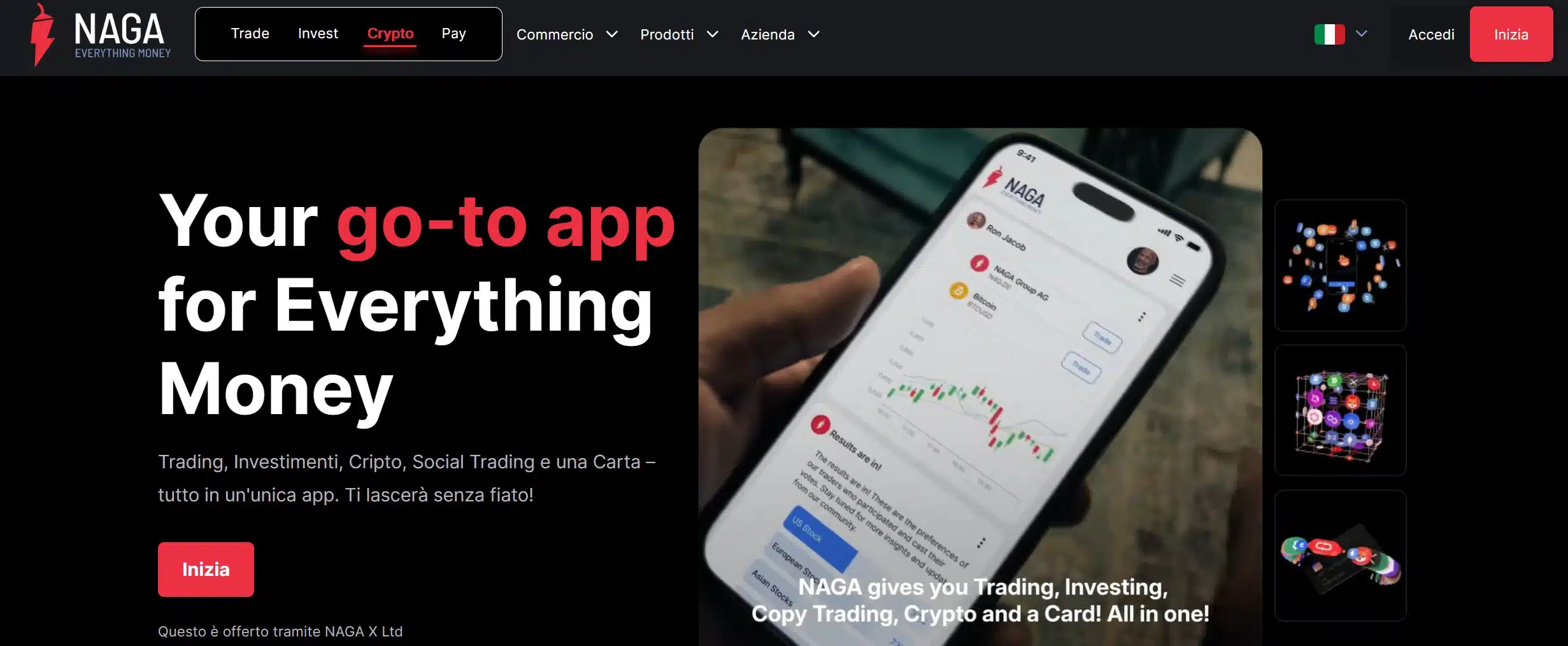 Nel corso degli anni Naga Markets ha subito diverse variazioni, espandendo il suo ecosistema a macchia d’olio in molti territori. Al momento di questa stesura, all’interno dell’official site, è possibile constatare la presenza di 4 sezioni principali: Trade (dedicata agli investimenti tradizionali sui mercati finanziari), Invest (servizio specifico con condizioni agevolate), Crypto (dedicata interamente al mondo delle negoziazioni su criptovalute) ed infine Pay (l’ennesime rivoluzione nel mondo dei pagamenti proposta dal gruppo.