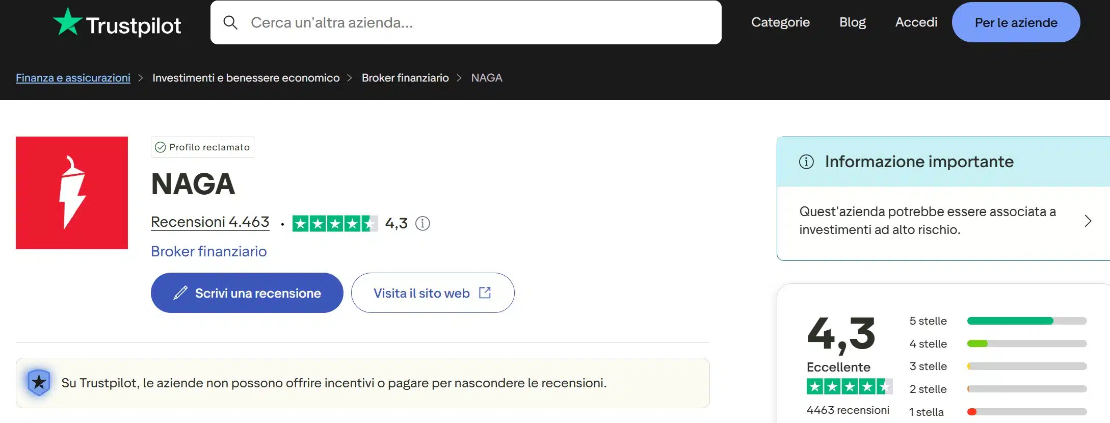 TrustPilot è una piattaforma che raccoglie testimonianze degli utenti sui servizi online e offline. Esiste una pagina anche relativa a NAGA, che raccoglie più di 4.460 testimonianze, in larga parte verificate. Qui in basso, puoi subito visionare l’anteprima: