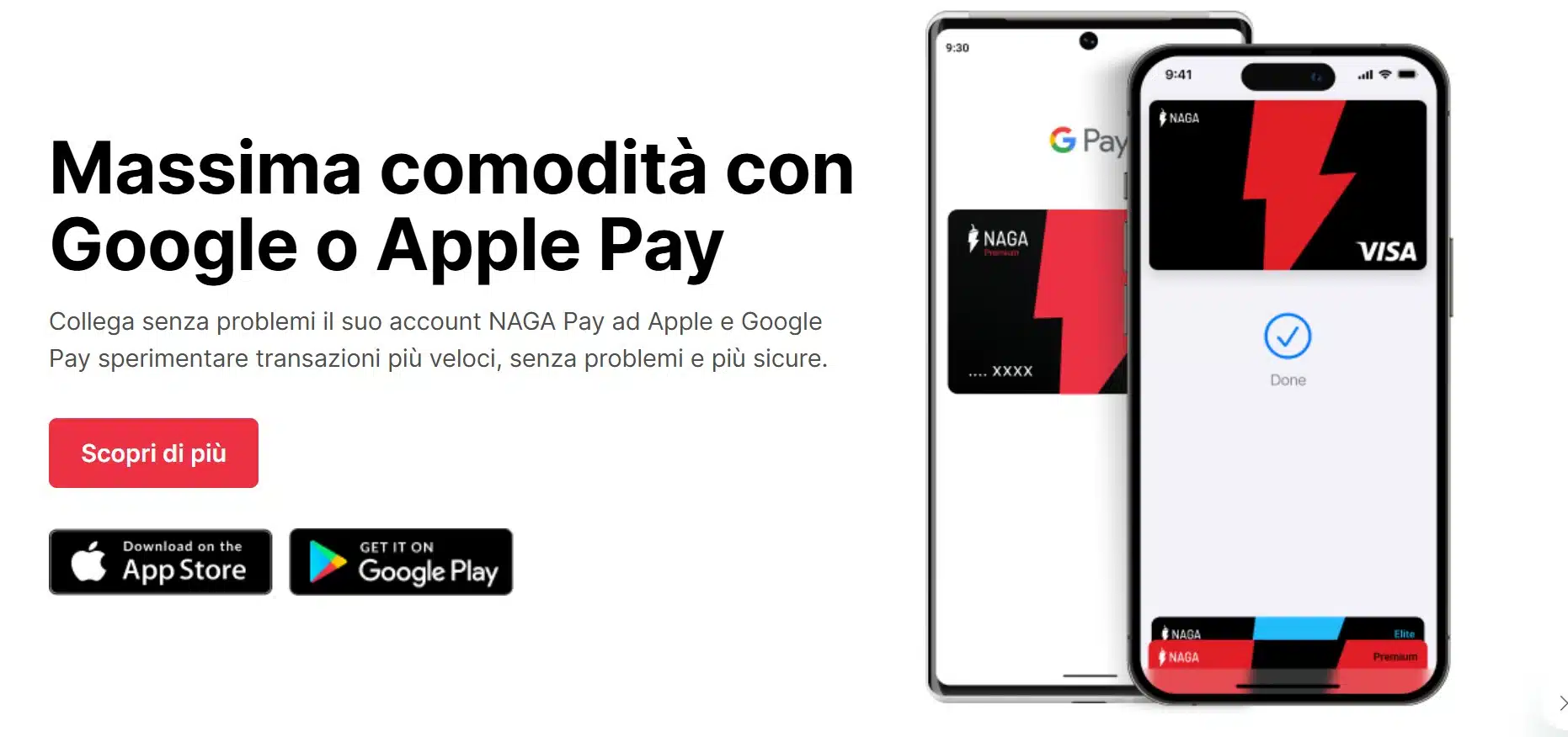 - NAGA Premium: al momento è offerto con un costo mensile di 4,99€ e offre la consegna della carta gratis, 3 prelievi gratuiti al mese (fino a 300 euro al giorno) ed un sistema Cashback dell’1,5% (su spese fino a 1000 euro al mese).