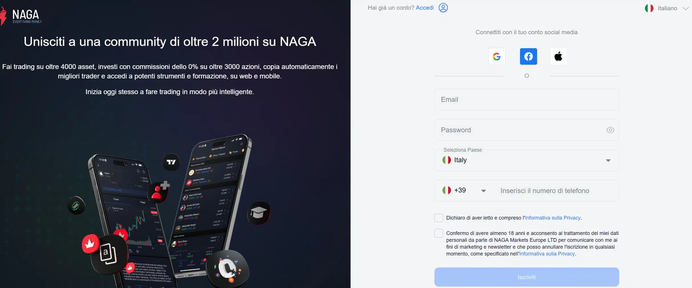 Il minimo di investimento per operare con Naga Markets è di 50$.