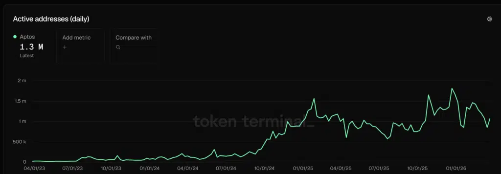 La metrica degli Active addresses (daily) di Aptos mostrano una crescita significativa dal 2024, con picchi oltre 1,5 milioni e valori recenti intorno a 1,3 milioni.