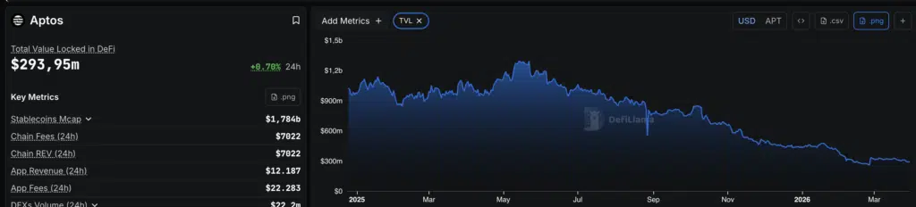 Oltre il ribasso del prezzo si registra anche un calo progressivo delTVL di Aptos nel corso del 2025 fino agli attuali 293 milioni di dollari, segnalando una contrazione dell’attività DeFi. Nonostante ciò, le metriche evidenziano una leggera ripresa nelle ultime 24 ore (+0,70%). La capitalizzazione delle stablecoin resta elevata (1,78 mld), mentre fees e ricavi risultano ancora contenuti.
