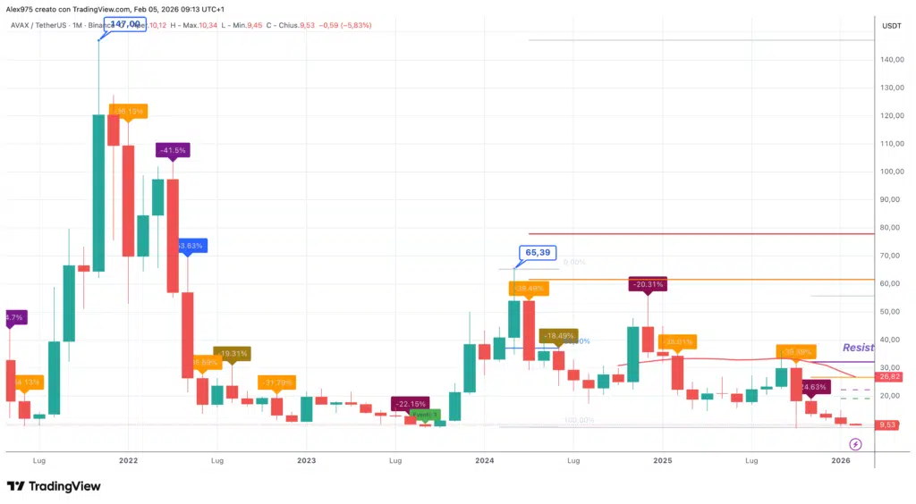Il 2025 si è mostrato travagliato per AVAX. Nel mese di febbraio aveva chiuso a -35%, il peggior ribasso da aprile 2024, superato poi da novembre 2025 con un -39%. L’anno si è poi chiuso con un -65%. Anche il 2026 si sta mostrando debole con il prezzo sui minimi del flash crash di ottobre scorso.