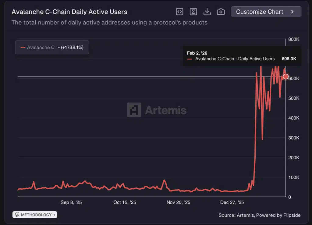 A livello on-chain spicca un incremento della rete Avalanche C-Chain, come evidenziato dalla metrica “Daily Active Users” che misura il numero di indirizzi attivi giornalieri che interagiscono con applicazioni sulla C-Chain.