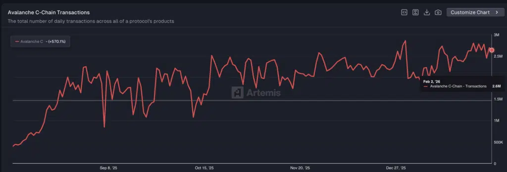 Più contenuto l’andamento delle transazioni come si può osservare sulla “Avalanche C-Chain Transactions” che ci indica il numero totale di transazioni giornaliere sulla C-Chain. La metrica mostra, dopo circa sei mesi di fase di profonda debolezza, una ripresa strutturale dell’attività. Le transazioni sono salite fino a 2.6M giornaliere, con un incremento del +570,1%. Il dato segnala maggiore utilizzo della rete, crescita operativa sostenuta e un ritorno dell’interazione on-chain rispetto ai minimi precedenti.