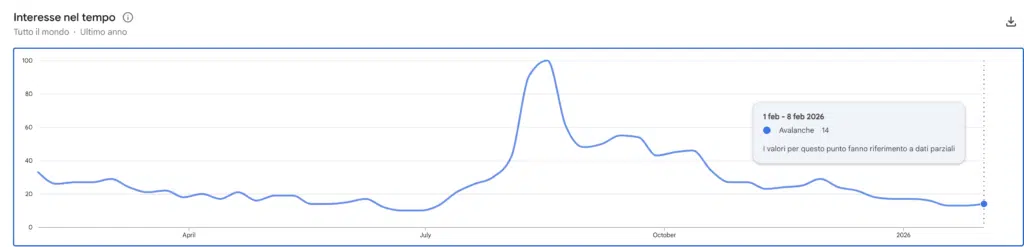Google Trends misura l’interesse di ricerca relativo nel tempo, normalizzato su scala 0–100. Il valore non indica volumi assoluti, ma confronto rispetto al picco massimo del periodo. Nell’ultimo anno Avalanche ha mostrato un picco estivo vicino a 100, seguito da un progressivo raffreddamento.