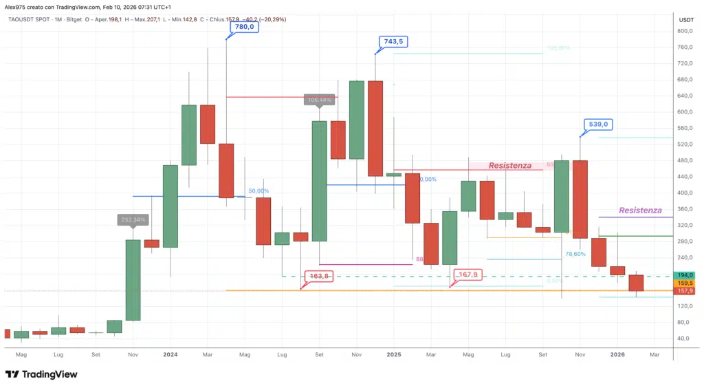 Nel 2026 TAO sta proseguendo la fase di downtrend con un -28% e il prezzo ora si trova nell’area dei minimi a 160 USDT già toccati nell’agosto 2024 e aprile 2025. Per provare a uscire da questo scenario di deve andare al breakout della resistenza di medio periodo area 220 USDT. Il superamento confermerebbe la forza del rimbalzo.