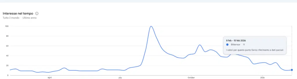 Il grafico di Google Trends mostra l’interesse di ricerca nel tempo per Bittensor a livello globale nell’ultimo anno.